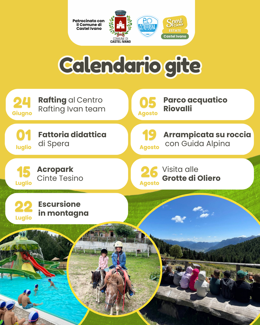 Ogni mercoledì è dedicato a un’esperienza speciale! Rafting, giornate in piscina o al lago, escursioni in montagna, mountain bike e parchi acquatici: un’avventura diversa ogni settimana per rendere l’estate ancora più entusiasmante!